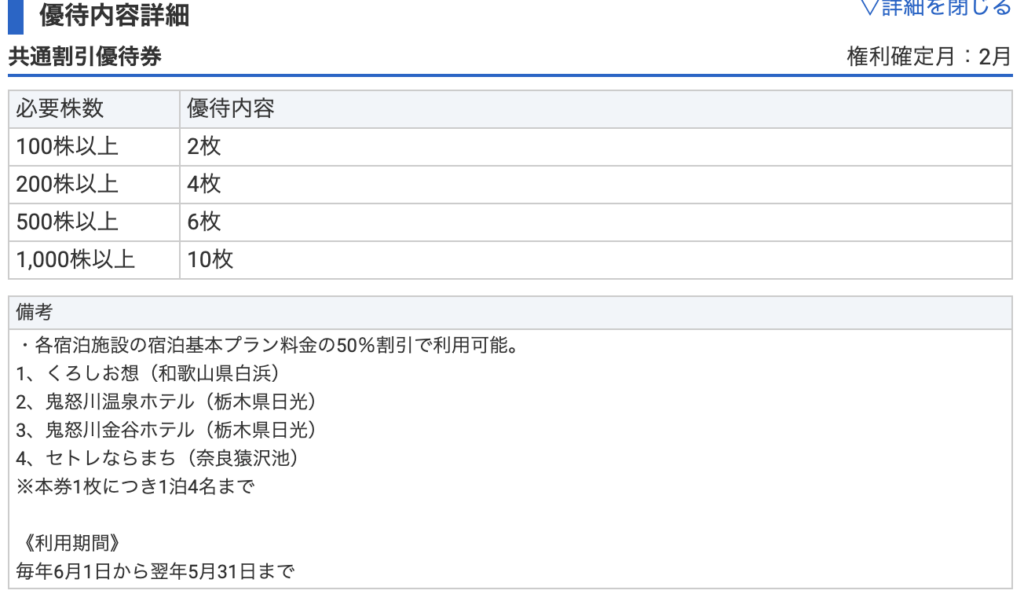 宿泊料金が半額になる優待、しかも1泊4名までです。