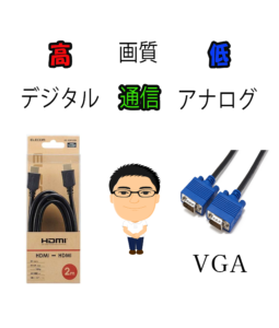 パソコンとモニターの接続には、PCとASUS製のモニターとはHDMI(※デジタル接続かアナログ接続かの違い、HDMIはデジタル接続、デジタル接続の方がアナログ接続よりも画質が綺麗※)で接続して、Lenovoのモニターについては、VGAの端子(※アナログ端子※)で接続しています。