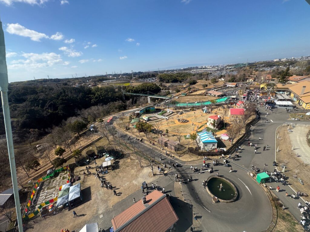 観覧車から撮影した全体像。中央の谷に掛かっているのが吊り橋で、これを渡って動物や体験コーナーがあるエリアに移動できます。