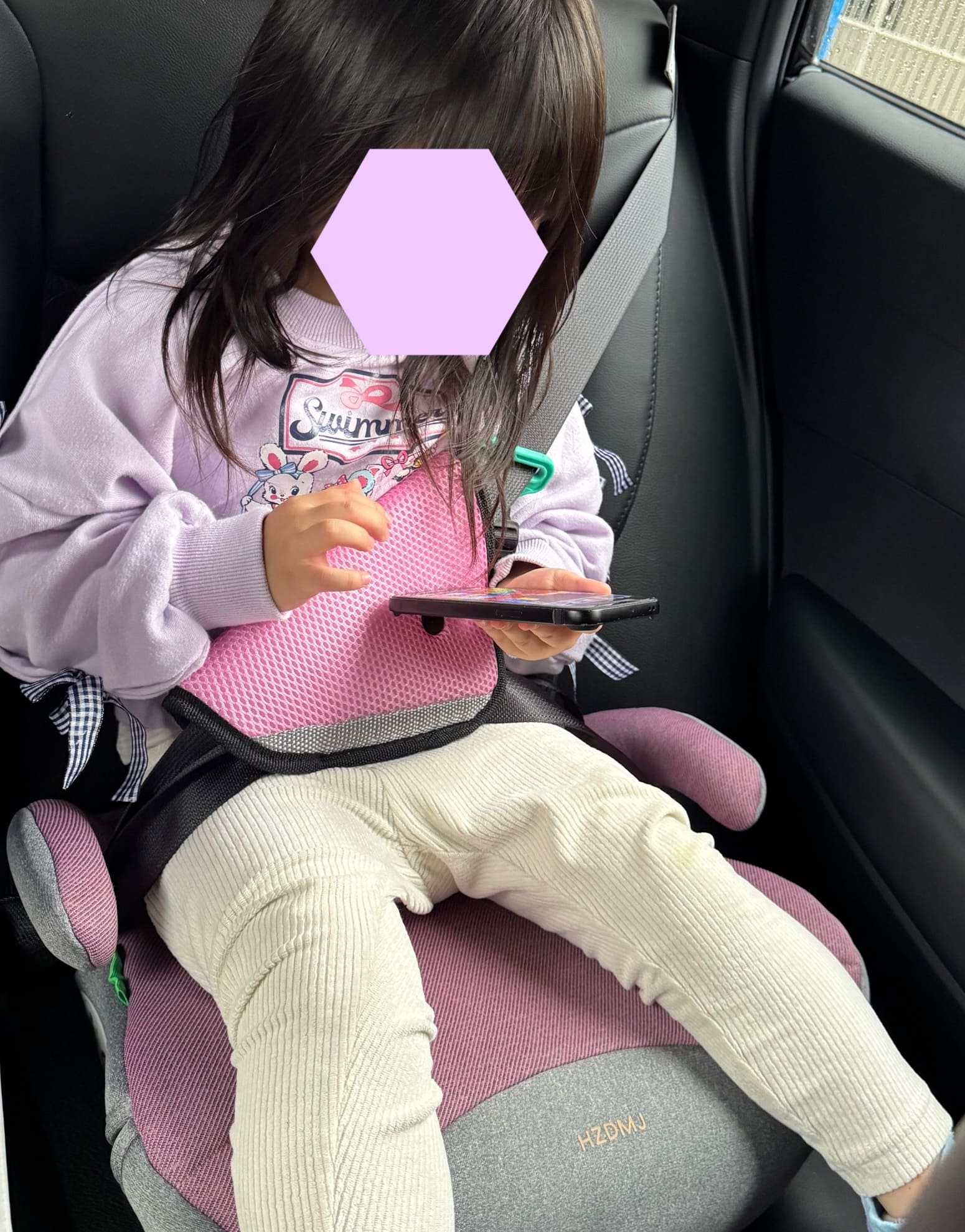 という前置きをしつつ、私の娘が4歳になってチャイルドシートから抜けてくることもしばしばあったので、今回娘が好きなピンクのジュニアシートと大人向けに作られているシートベルトを子供の体のサイズで使えるようにする補助アイテムを使って娘の座席を作りました。