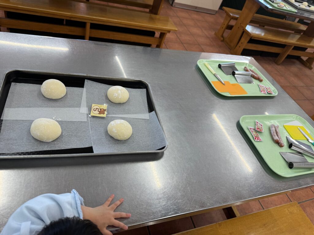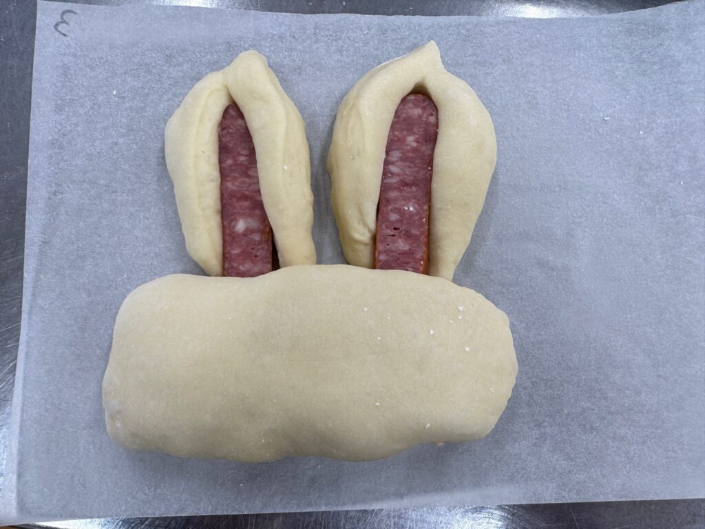 そのあとは、パンをうさぎの顔と耳に切って、ウインナーをそれぞれ切ったパンに挟んだり、中に入れたりして形を整えていきました。