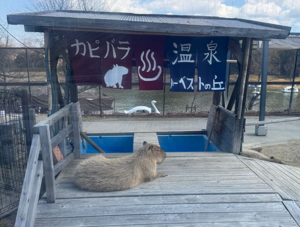 吊り橋を渡ると、カピバラ温泉や羊などがいるちょっとしたふれあいコーナーがあります。