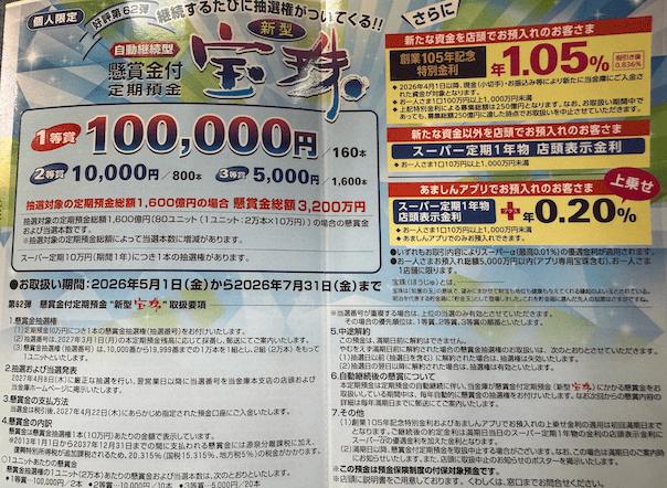 あまり聞きなれない「懸賞金付き定期預金」というもので、満期が近くなると抽選で最大10万円が当たるという懸賞金がついた定期預金です。