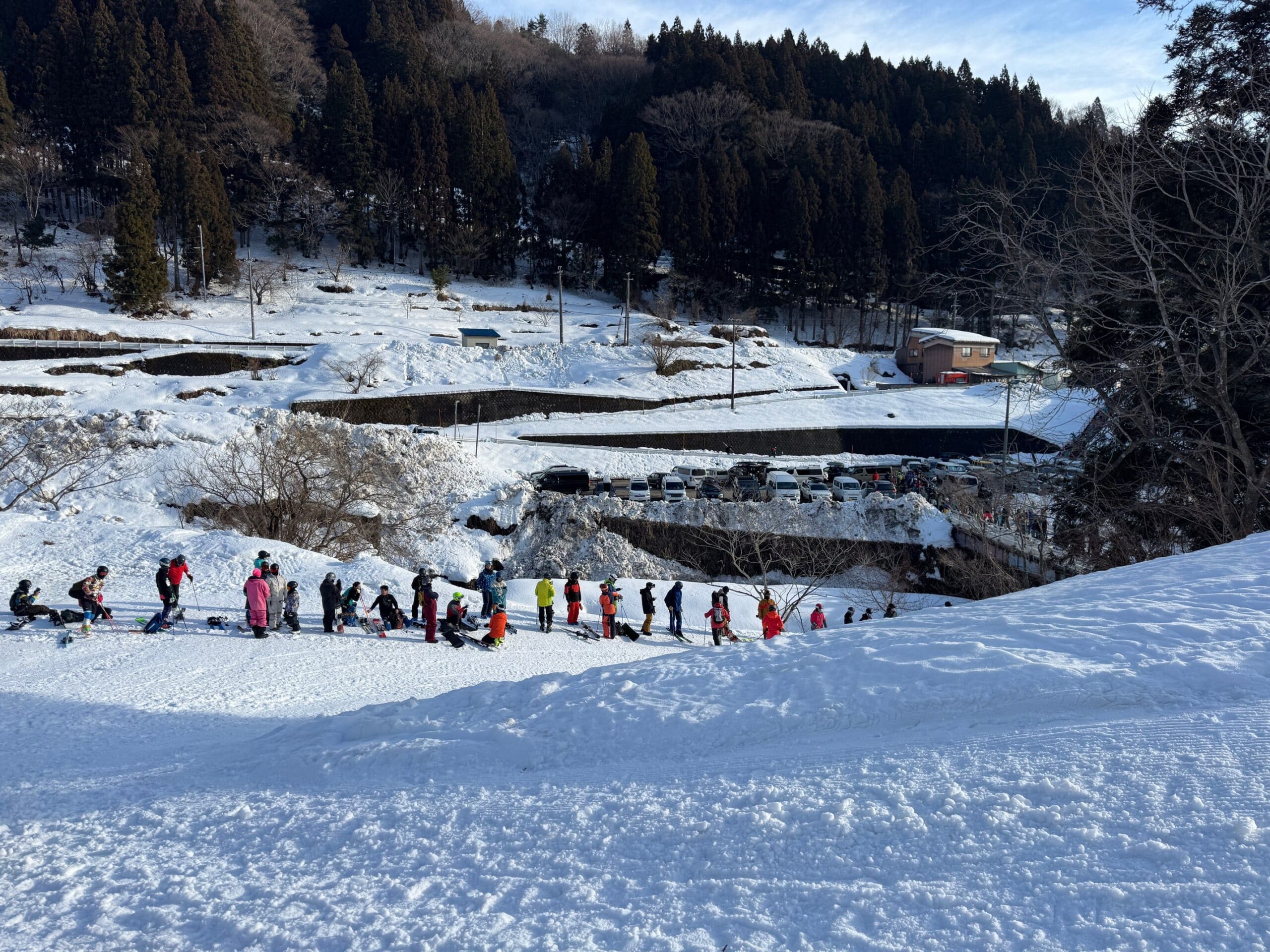 この日は、プライズテストの事前講習もあったのでリフトにはかなりの列ができていて、橋を渡ったところのリフト乗り場からゲレンデを登って列が続いていました。