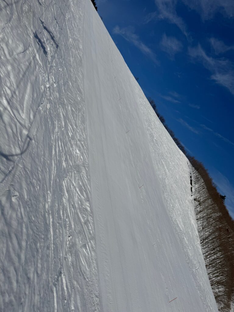 前日、午後から行って凸凹だったのですが、さすが朝一のゲレンデは滑りやすかったです。