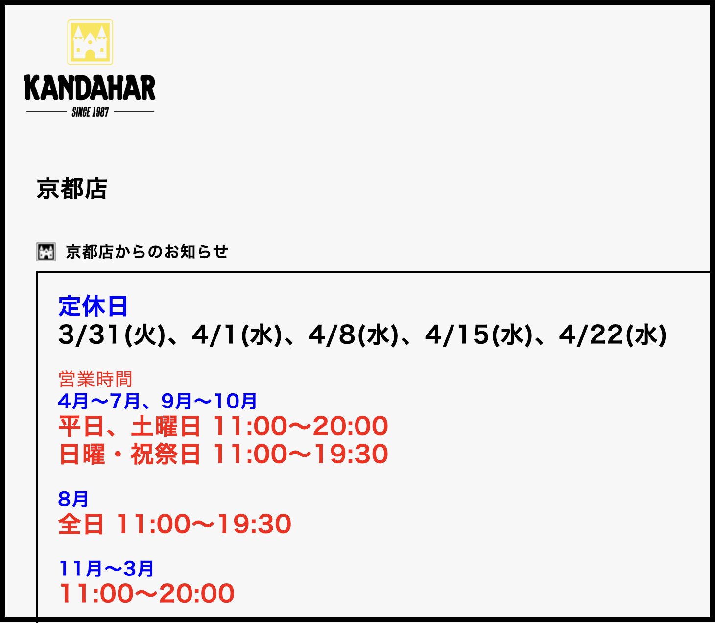 カンダハー京都店ホームページより