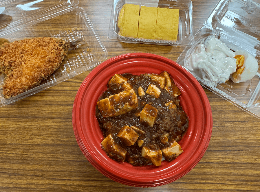 タルタルソースのチキンカツなど目に入る中、今回は、麻婆丼が一際輝いて見えたので、これをメインにすることにしました。
