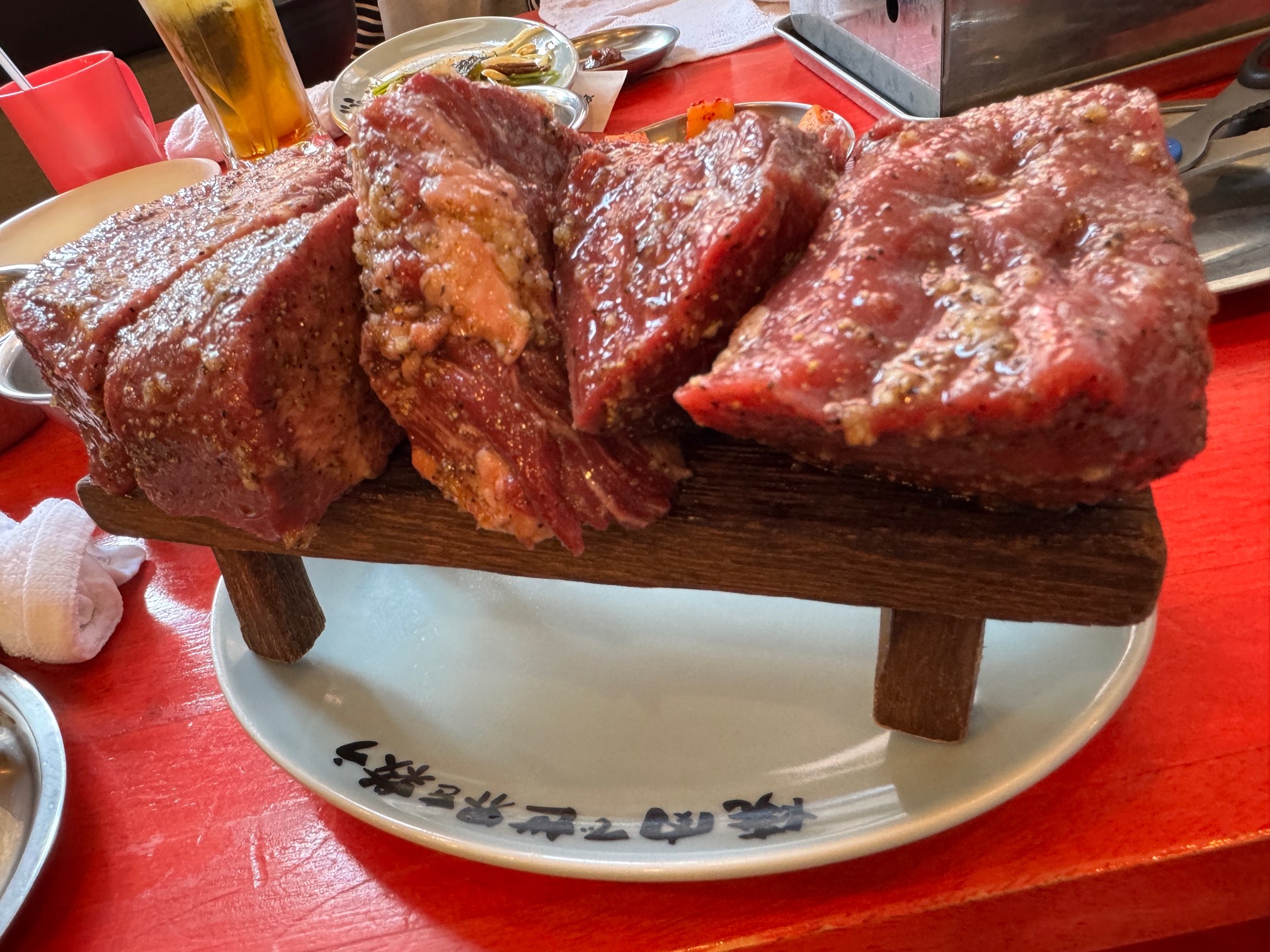 このお店では、注文したお肉によってスタッフさんが焼いてくれるというサービスがあるのですが、タン、ハラミ、ヘレの伝説盛りを注文、スタッフさんがほぼマンツーマンスタイルで席についてくれて焼いてくれました。