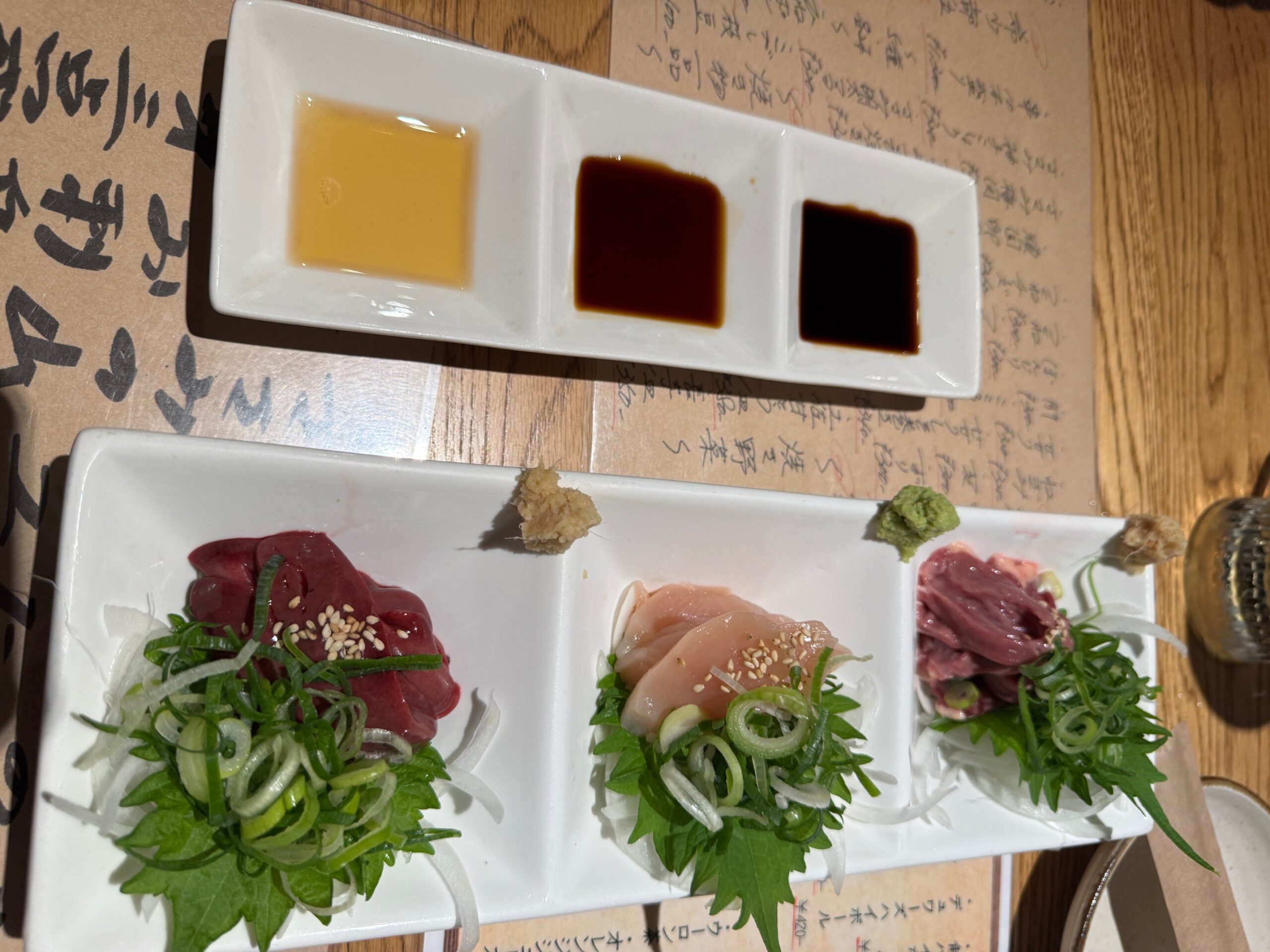 肝と心臓とささみだったと思いますが、1皿に3種類の刺身が並び、3種類のツケダレが並びます。
