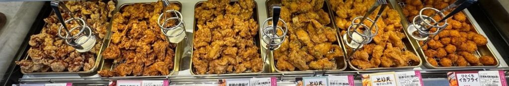 揚げ物のショーケースの最下段に設けられた6種類の唐揚げから好きなものを好きなだけパックに詰めての測り売りです。